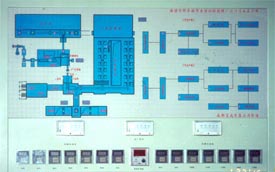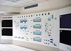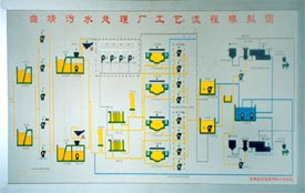 近两年来,成都宝成电器公司的玛赛克模拟屏更加广泛地用于环保行业,主要是在自来水厂、真空制盐工艺流程图显示、污水处理厂,城市生活垃圾处理、工业垃圾处理、工业废水处理……等领域里的工艺流程图的模拟显示,高速公路汽车流量控制模拟显示;化工厂的工艺流程图用玛赛克屏模拟显示: